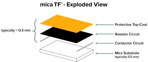 Our patented sol-gel thick film technology has 2-10x the watt density of other heating elements, like Kapton® Polyimide.